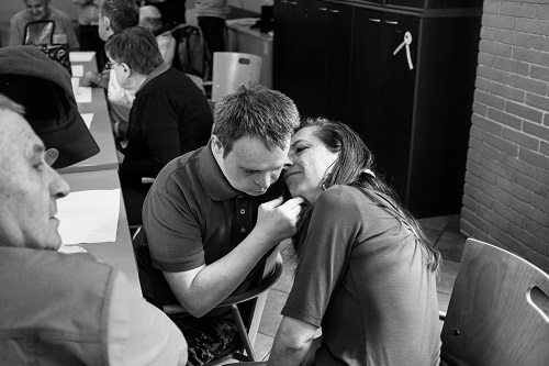 Siamo partiti proprio da questo punto… questo è veramente il vostro grande problema. Pensi alla posizione del malato. Tendenzialmente, è la posizione del “morto”, a letto, orizzontale, o al limite seduto. Mentre il sano è in piedi, verticale e si muove. Il verticale è il dominatore. Questo accadrà sempre e in un certo senso è anche ovvio: il sano dà al malato l’assistenza. Esiste una sorta di “superiorità” che è nell’ordine delle cose, però il lavoro fondamentale da fare, anche a livello familiare, è di riuscire a dare “un aiuto che gli stesse di fronte “. A guardare “occhi negli occhi”. In questo senso bisogna stabilire una sorta di alleanza tra il malato, o il disabile, e il sano, per riuscire entrambi a camminare insieme. Cioè colui che è in piedi deve mettersi un po’ al livello dell’altro. L’educatore deve riuscire (cosa che succede) a capire il linguaggio incomprensibile dell’altro. Vedo madri che capiscono un discorso fatto di mugugni. Ci sarà una parte di decifrazione però è fuori di dubbio che l’altro si sente compreso. Ecco, questo livello di “occhi negli occhi” è un esercizio che devono fare l’educatore o il volontario. A fare la carezzina quando passano le autorità, sono capaci tutti….